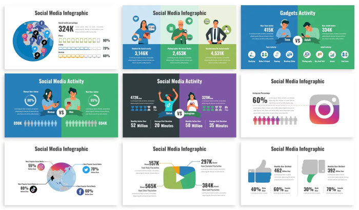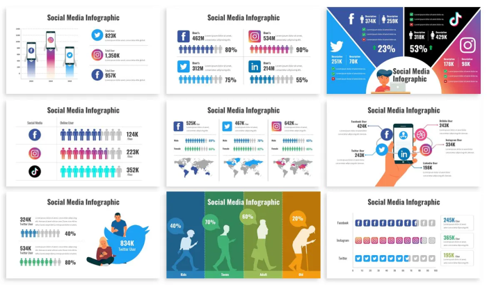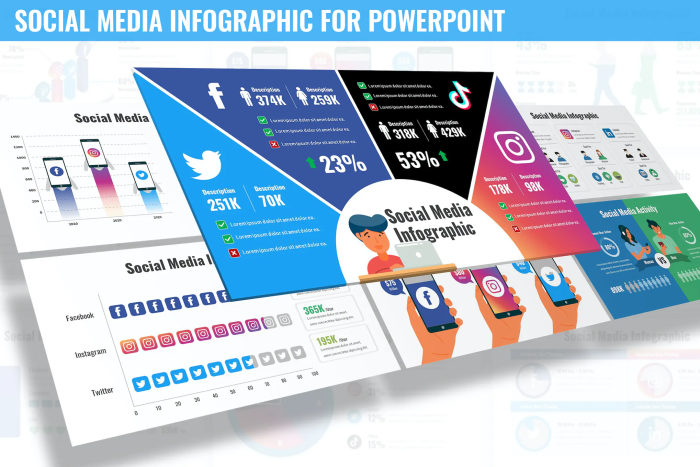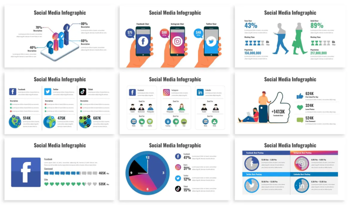 Template Powerpoint yang berisi infografis tentang media sosial, internet marketing, dll., semua bagan dapat diedit hanya dengan menggunakan powerpoint